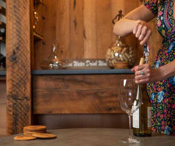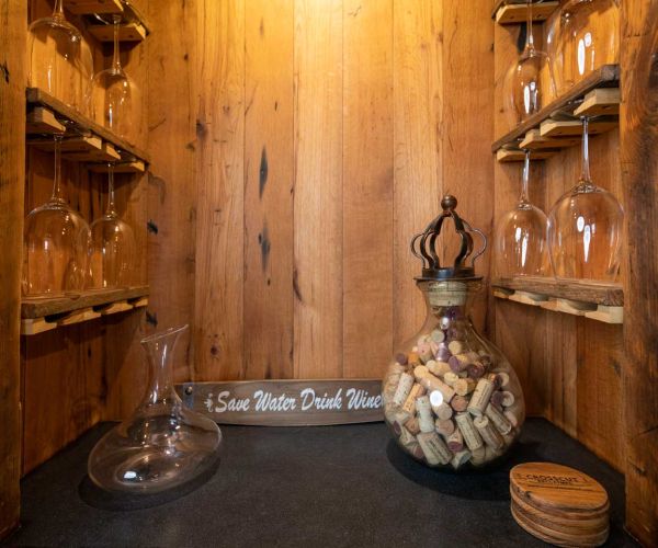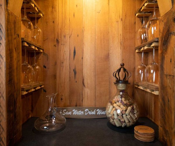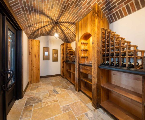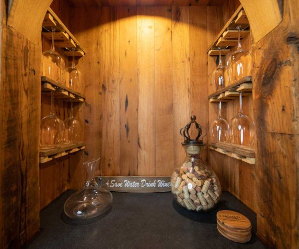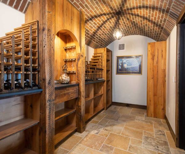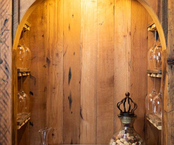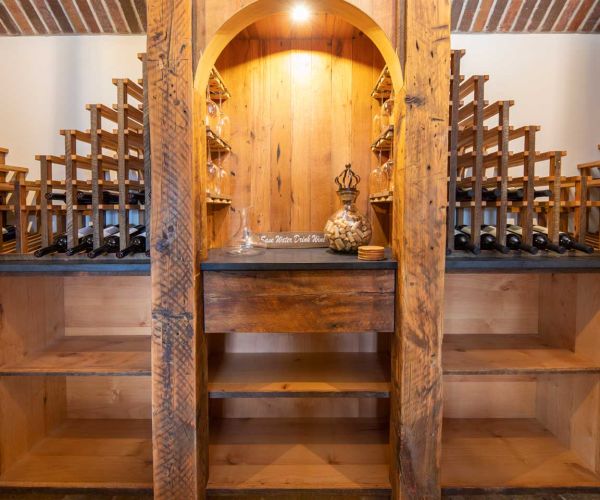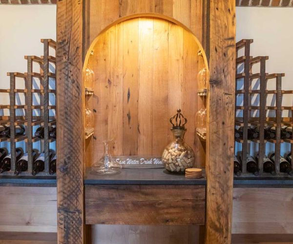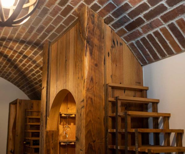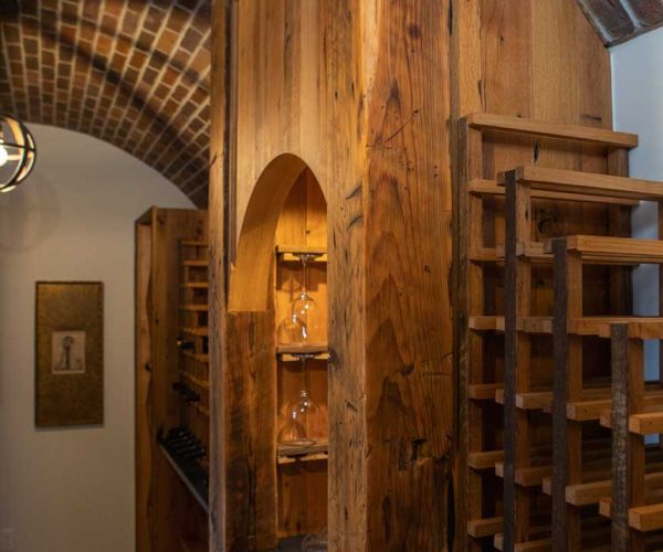 This cellar houses a smaller but premium collection and is designed to store and display. The arched corking station complements the barrel ceiling creating a “dormer” effect making the space feel bigger and more inviting. This is a great example of different finishing techniques, we combined heavily sanded reclaimed paneling with original face reclaimed timbers to create this rustic yet refined look.